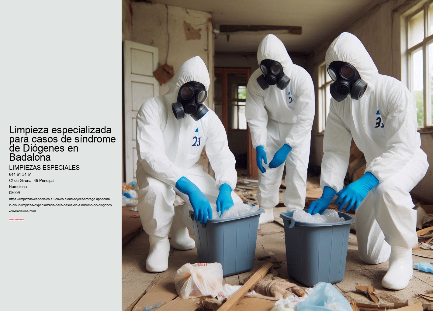 ¿Por qué esperar más? Póngase en contacto con nosotros hoy mismo y recupere la tranquilidad y seguridad de su hogar. Llame ahora para recibir un presupuesto gratuito y sin compromiso. Mejor opción para la Limpieza especializada para casos de síndrome de Diógenes en Badalona !LLAMA AHORA¡ No enfrente este desafío solo, estamos aquí para asistirle en cada paso del camino. ¡Transforme su hogar y su vida con Limpiezas Especiales!