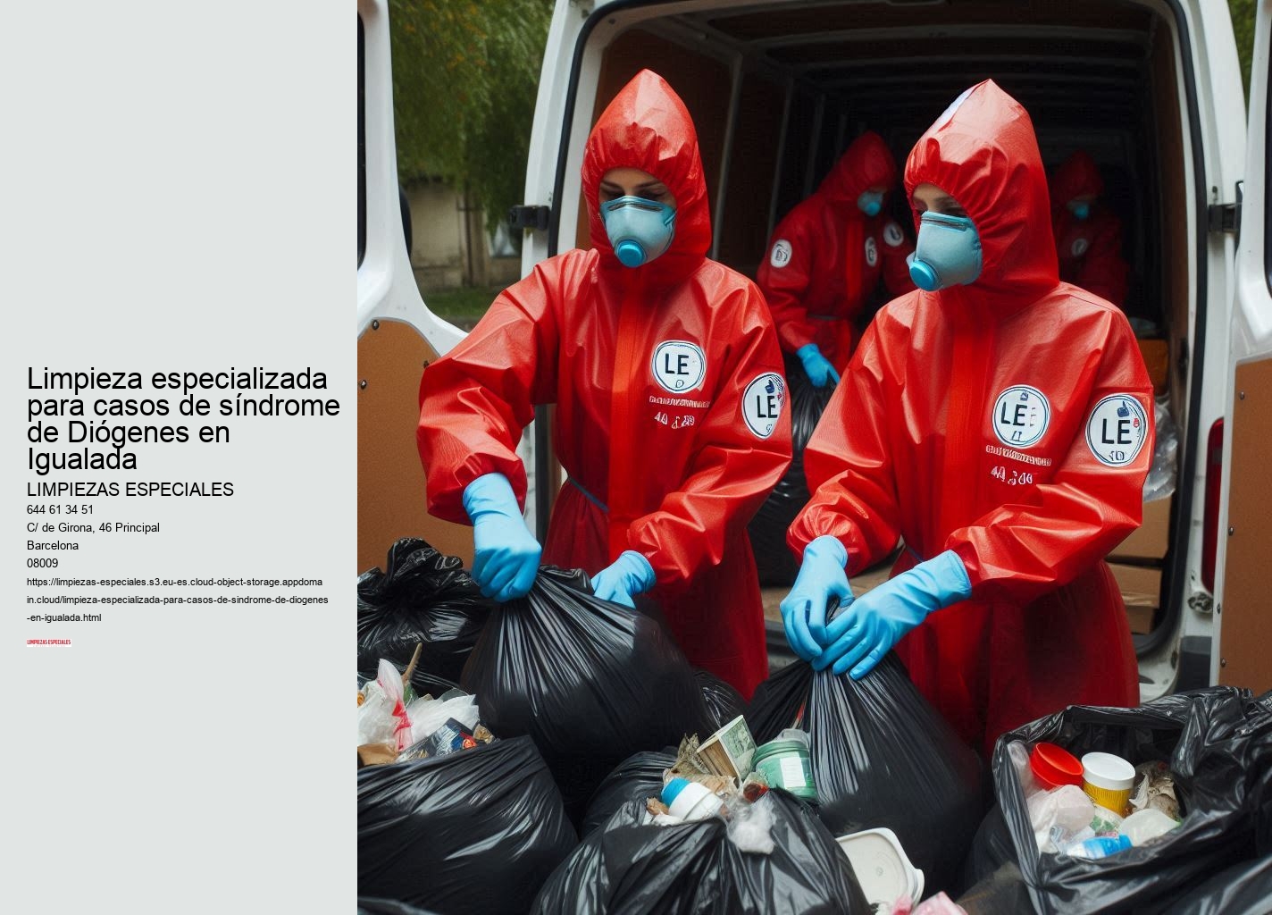 ¿Por qué esperar? Contacte con nosotros hoy mismo y recupere la tranquilidad y seguridad de su hogar. Garantía total en Limpieza especializada para casos de síndrome de Diógenes en Igualada !Contacta ahora¡ Llame ahora para obtener un presupuesto gratuito y sin compromiso. No enfrente este desafío solo, estamos aquí para ayudarle en cada paso del proceso. Mejor opción para la Limpieza especializada para casos de síndrome de Diógenes en Igualada !LLAMA AHORA¡ ¡Transforme su hogar y su vida con Limpiezas Especiales!