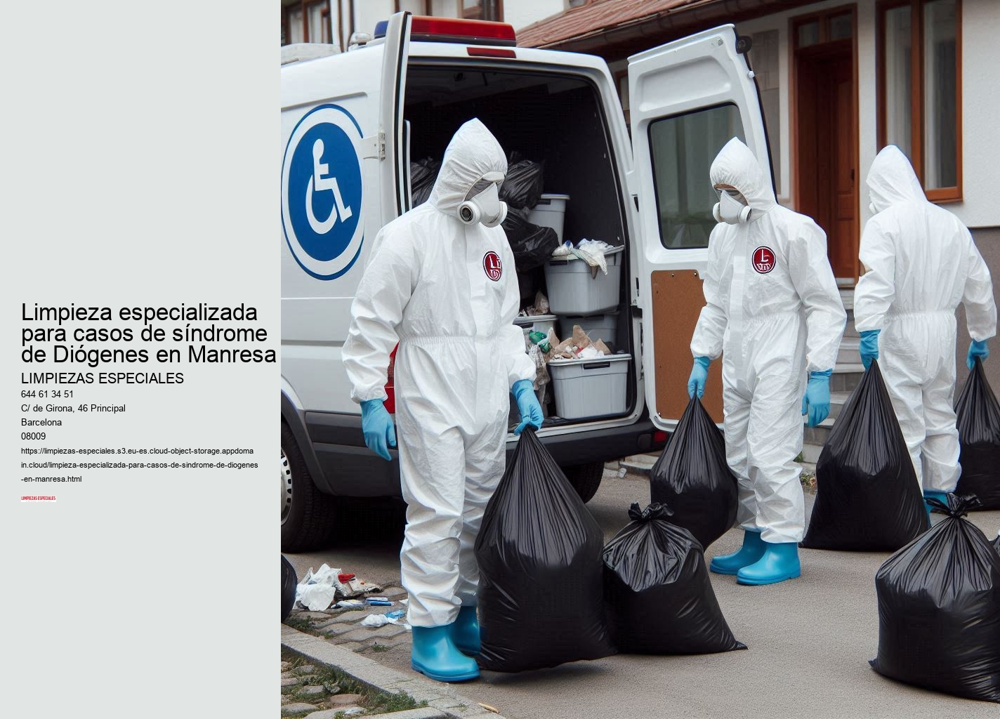 ¿Por qué esperar? Contacte con nosotros hoy mismo y recupere la tranquilidad y seguridad de su hogar. Llame ahora para obtener un presupuesto gratuito y sin compromiso. No enfrente este desafío solo, estamos aquí para ayudarle en cada paso del proceso. Mejor opción para la Limpieza especializada para casos de síndrome de Diógenes en Manresa !LLAMA AHORA¡ ¡Transforme su hogar y su vida con Limpiezas Especiales!