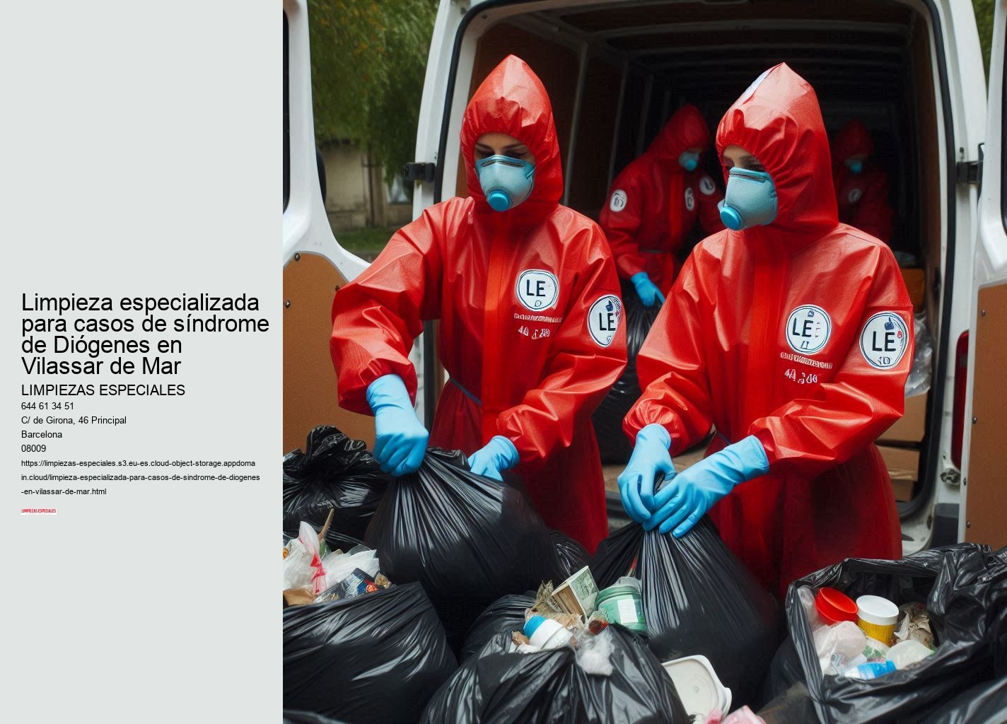 El síndrome de Diógenes no solo afecta el entorno físico, sino también el bienestar emocional de las personas involucradas. Mejor opción para la Limpieza especializada para casos de síndrome de Diógenes en Vilassar de Mar !LLAMA AHORA¡ En Limpiezas Especiales Vilassar de Mar, no solo limpiamos; restauramos hogares y vidas. Utilizamos equipos y productos de alta calidad para desinfectar y esterilizar su vivienda, eliminando riesgos sanitarios y devolviendo un ambiente saludable.